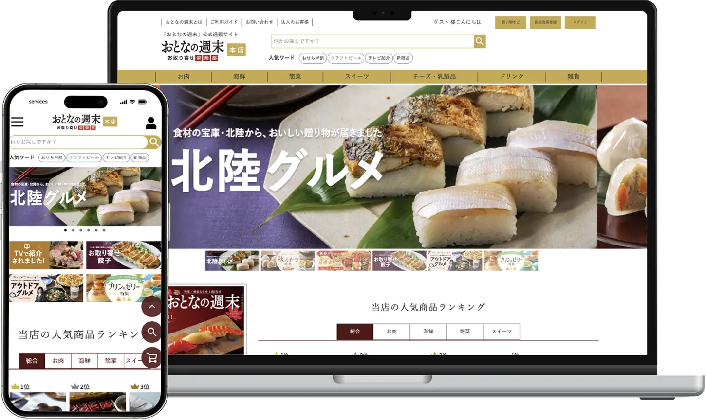 「食」に主軸を置いたEC事業を展開しております。自社バイヤーが全国の特産品を収集し、自社ECサイトや大手ショッピングモールにて販売しております。自社バイヤーが全国の特産品を収集し、自社ECサイトや大手ショッピングモールにて販売しているほか、「おとなの週末」など、講談社の各種出版物と連動したECサイトを共同運営しております。